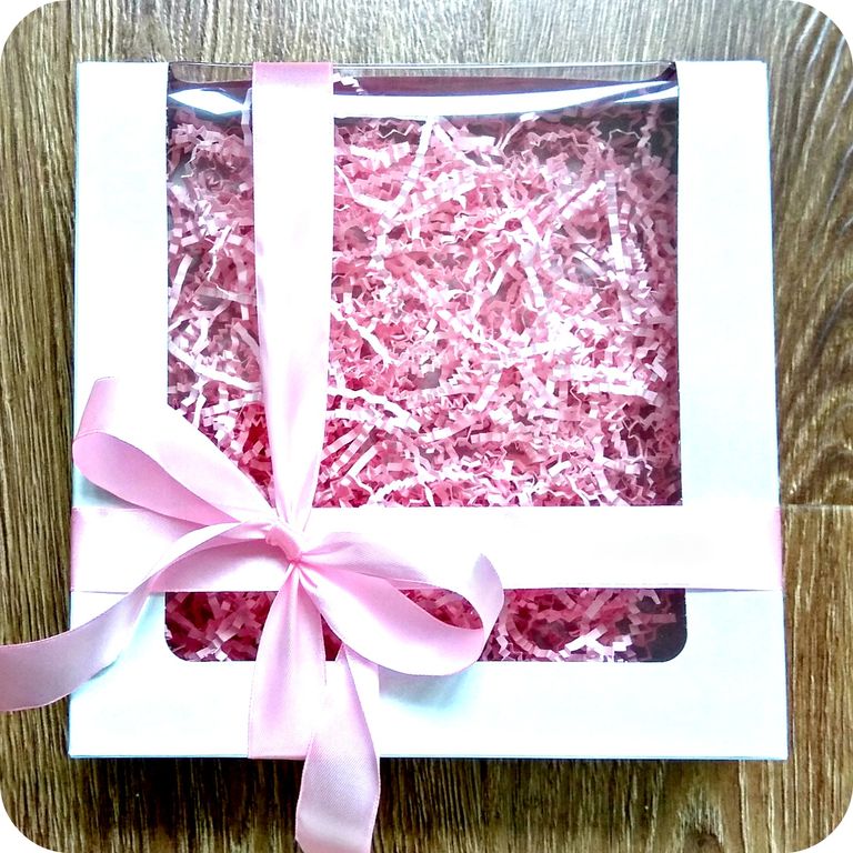 Подарочная упаковка - Подарочная белая коробка с прозрачным окошком, наполнителем и розовым бантом