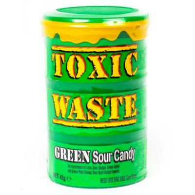 В зелёной банке Toxic Waste Green пять вкусов для всех любителей свежих зелёных фруктов с кислинкой и солнечных цитрусов: зеленая груша, зеленое яблоко, киви, дыня и лайм. Кроме неё существует ещё несколько вариаций супер кислых конфет Токсик Вейст, например Toxic Waste Purple или Toxic Waste Red