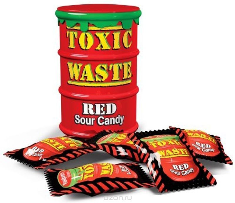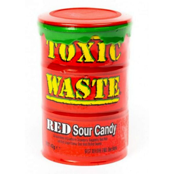 Входят в топ самых кислых леденцов в мире по данным международных кондитерских компаний. Конфеты Токсик Вейст Red упакованы в яркую баночку в виде бочки химических отходов. Дизайн полностью олицетворяет запредельную кислость этих леденцов.